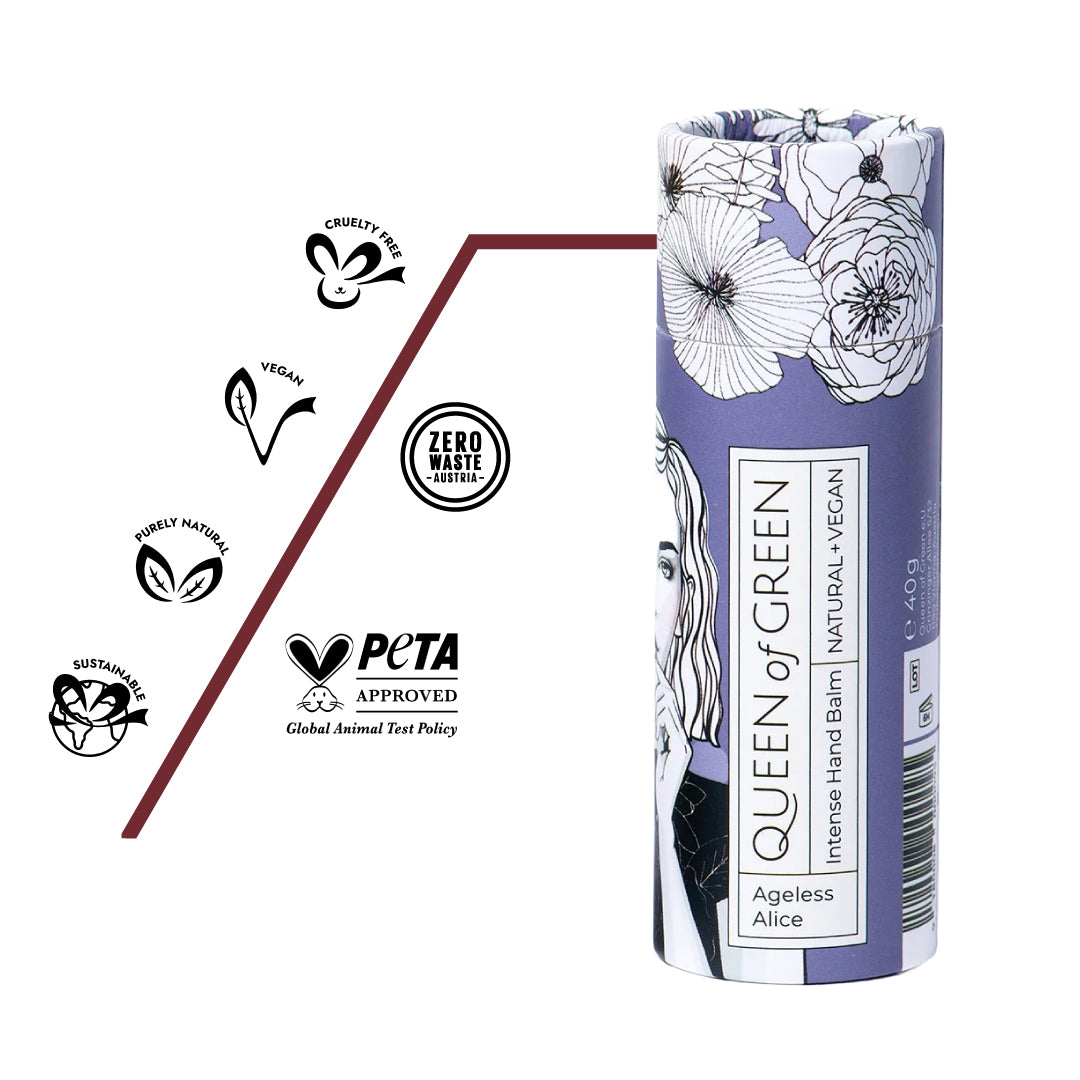 Dein reichhaltiger Handbalsam für trockene, raue und strapazierte Hände – perfekt für die tägliche Pflege zu jeder Jahreszeit. Ageless Alice schützt und regeneriert zuverlässig gegen Umwelteinflüsse wie Kälte, Wind, Sonne und trockene Luft. Die vegane, natürliche Formel kombiniert pflegendes Pracaxiöl, Jojobaöl und hydriertes Rapsöl mit heilenden Extrakten aus Ringelblume, Hopfen und Grüntee. Hyaluronsäure spendet intensive Feuchtigkeit und stärkt die Hautelastizität, während Vitamin E die Hände vor freien Radikalen schützt. Die cremige, schnell einziehende Textur mit dezentem, natürlichem Duft macht Ageless Alice zum idealen Begleiter für gesunde, zarte Hände. 100 % vegan, tierversuchsfrei und plastikfrei – nachhaltige Pflege mit Verantwortung.