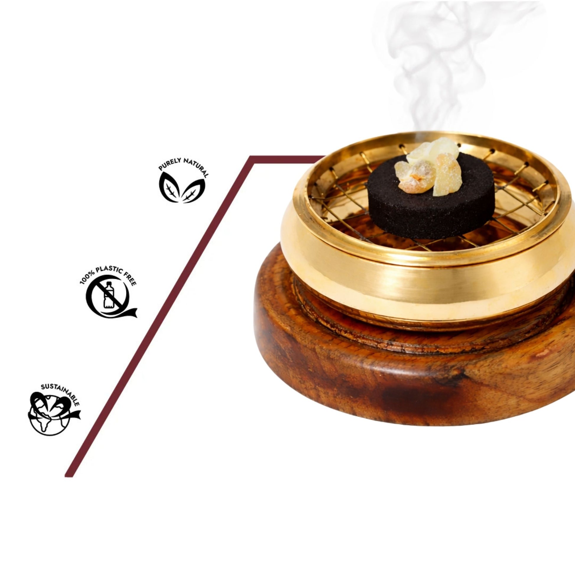 Der geölte Holzfuß bietet angenehme Haptik, natürliche Wärme und maximale Standfestigkeit. Das goldfarbene Metallgehäuse ist hitzebeständig, langlebig und leicht zu reinigen. Das abnehmbare Sieb trennt Kohle und Räucherware sicher, sodass du dein Räucherritual komfortabel und sicher genießen kannst.